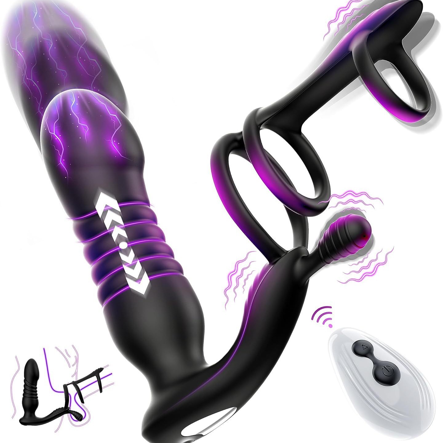 Black Remote Control Thrusting Prostate Massager With 2 Cock Ring Powerful Anal Plug